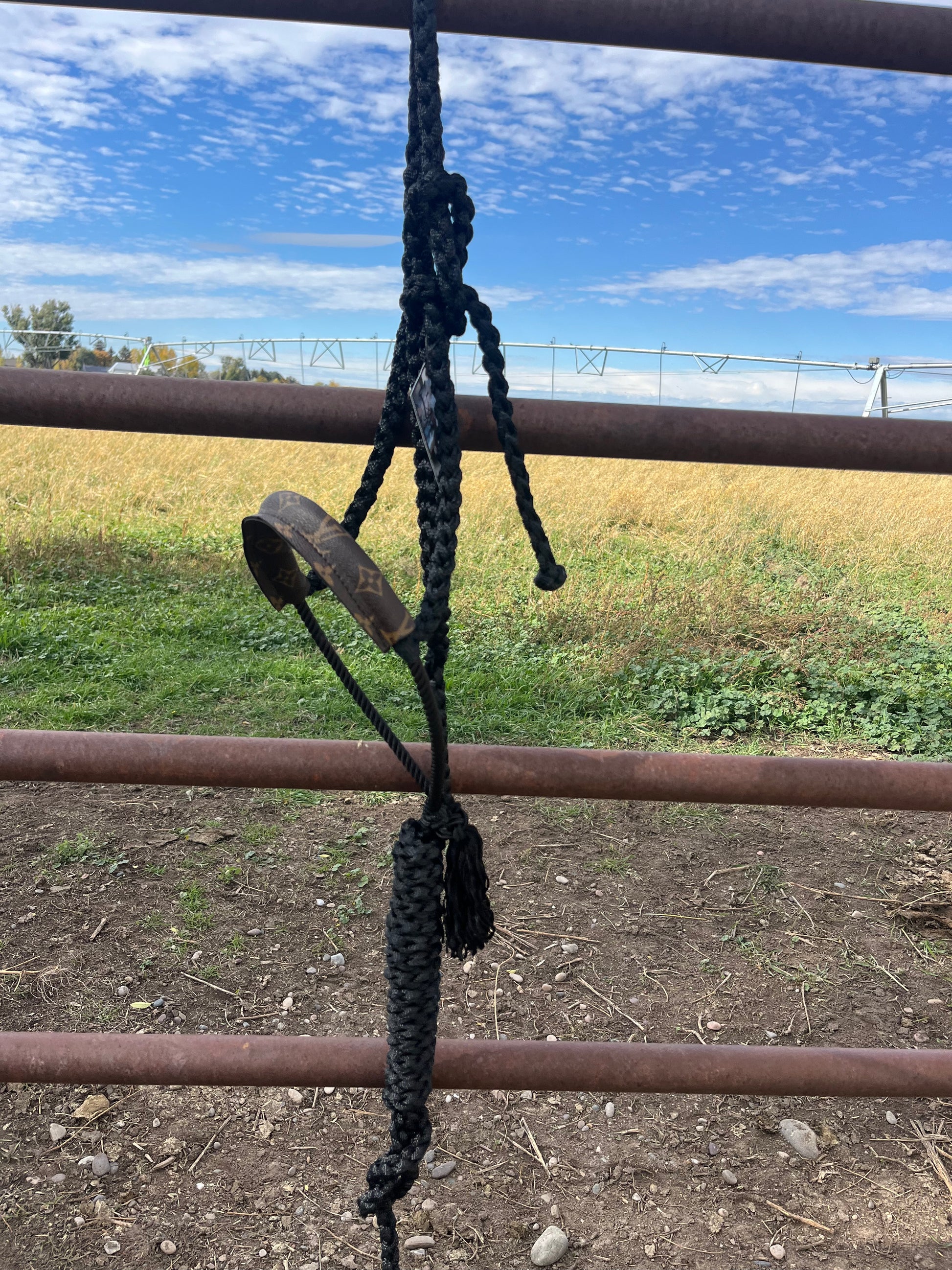 This Custom Rope Noseband Halter featuring LV inspired leather, adds a touch of elegance to the classic mule tape halter. Each halter comes with a 7ft lead rope.