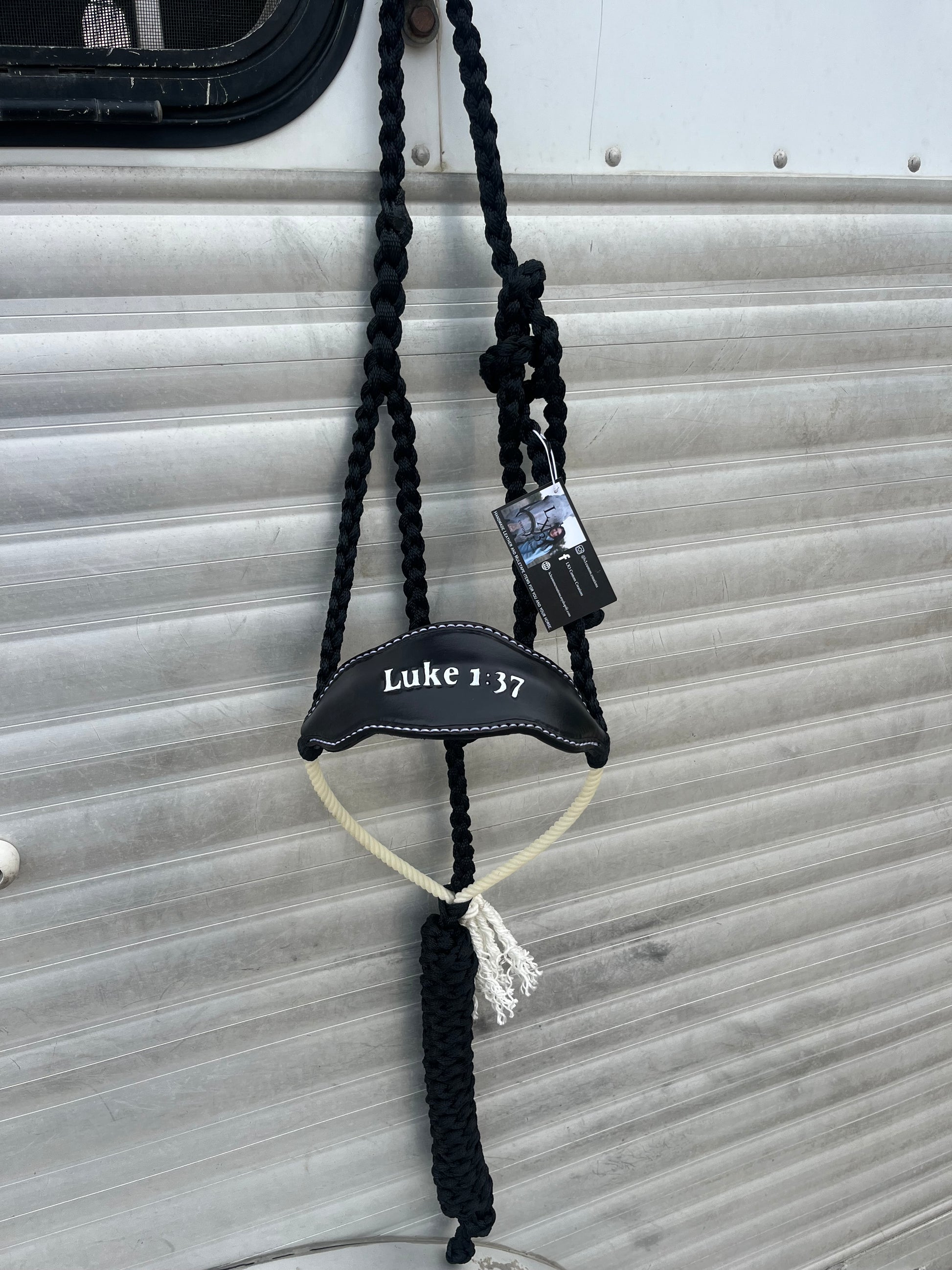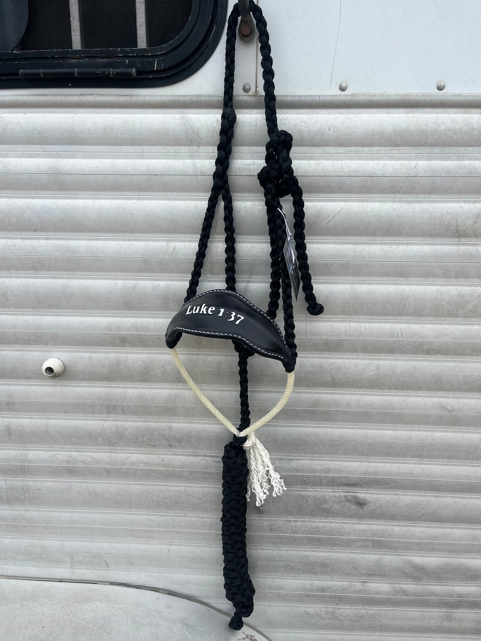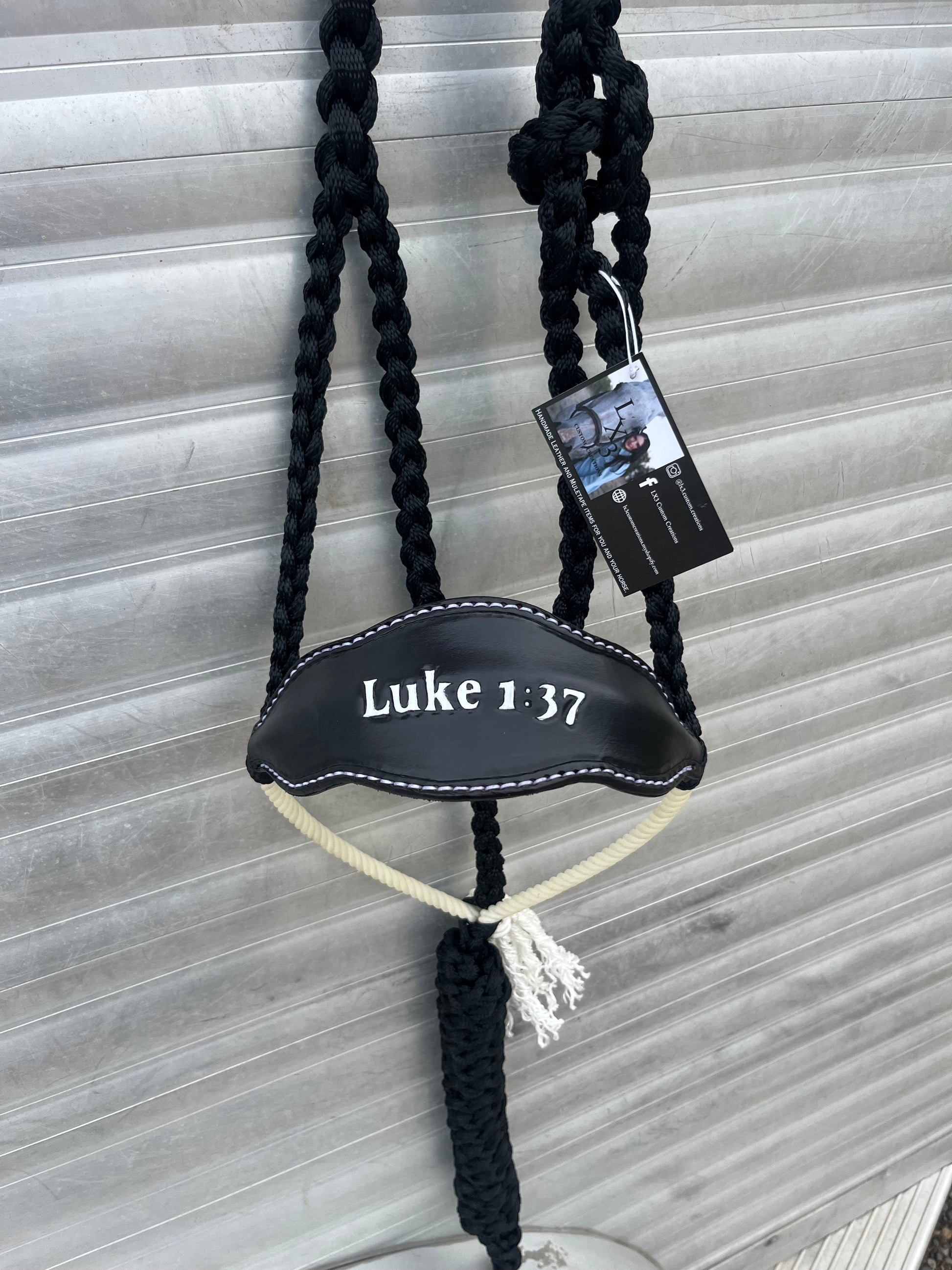 Experience the perfect combination of style and faith with our Ready to Ship Bronc x Rope Noseband Bible Verse Halter! Featuring a leather and rope noseband hybrid design, paired with a 7ft lead rope, this handmade halter showcases the powerful Bible verse "For with God nothing shall be impossible." Ready to ship!